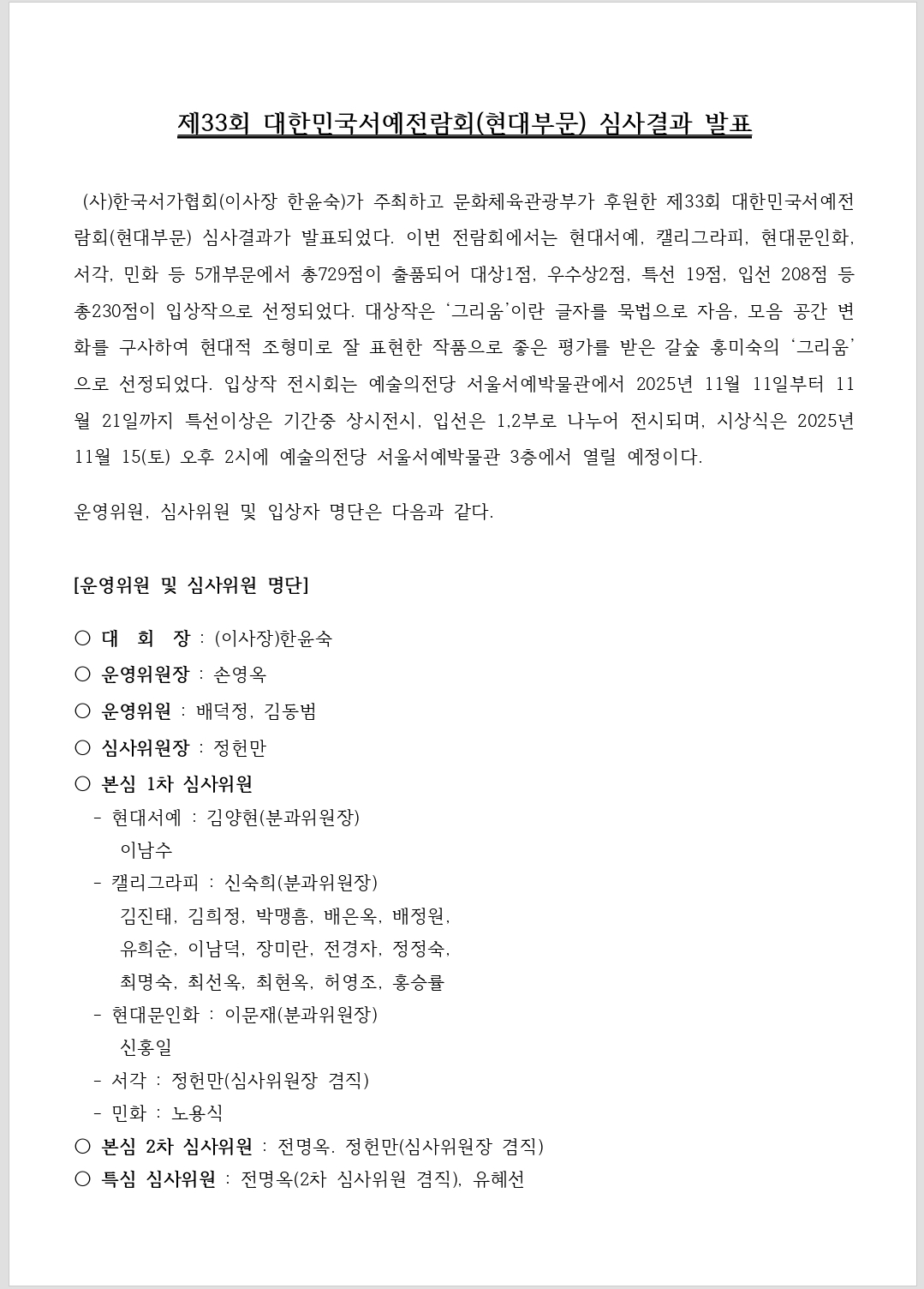(최종)제33회 현대전람회 최종입상자 보도자료250925.hwp